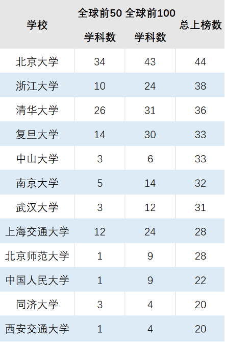 本次排名横跨5大学术领域和51项学科专业,遍及全球85个地区,对1440所大学的13883项大学学科的表现进行了独立的比较分析(比去年增加了72所大学)。北京大学再次以绝对优势领跑全国高校,共有44个学科入选榜单,数量为全国高校之首。其中,34个学科进入世界前50,43个学科进入前100(比去年增加了4个学科),成绩最为优异,展现出了雄厚的学科实力与强劲的发展态势。