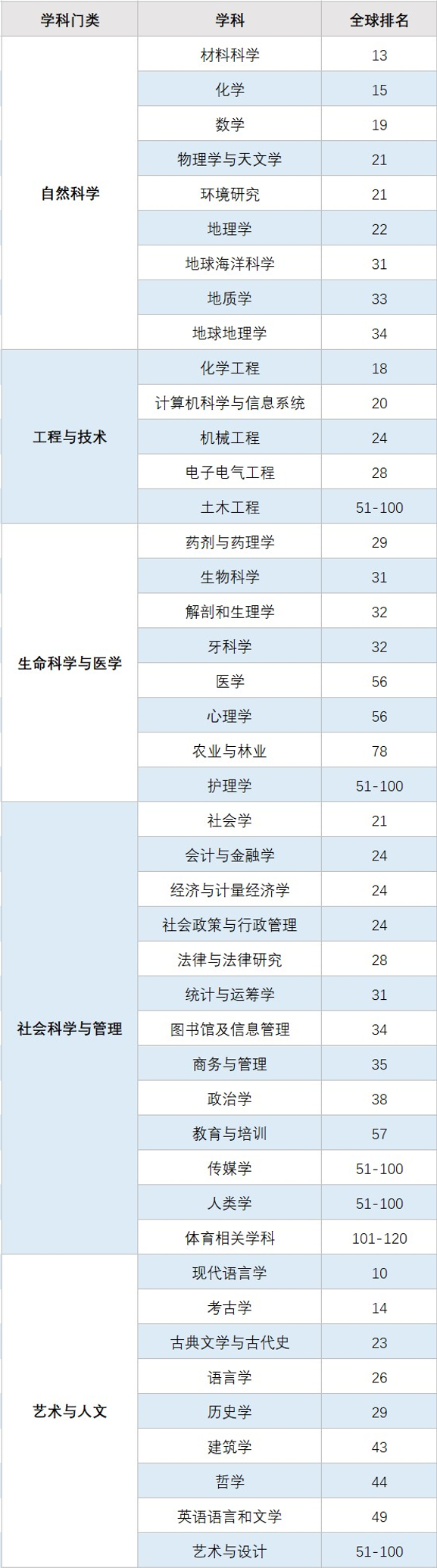 QS学科排名是基于QS对专业学者和雇主的全球调查、每篇论文的研究引文数和相关学科的Hirsch指数来评估的。这几个组成部分结合起来产生每个学科排名的结果,同时根据每个学科调整权重。