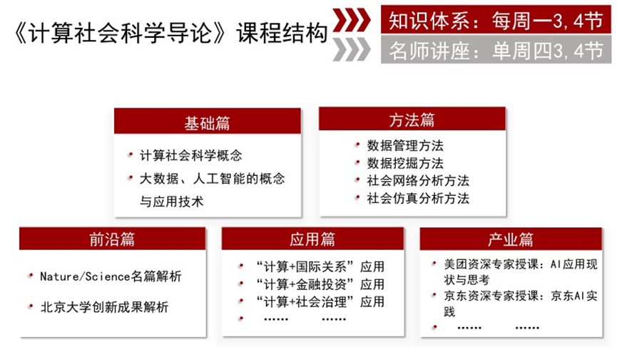 《知识体系》模块为同学们设计了“基础篇”、“方法篇”、“前沿篇”、“应用篇”和“产业篇”五项内容,由项目负责人计算机学院王腾蛟教授、陈薇副研究员以及中国社会科学调查中心姚佳慧老师共同授课。课程内容注重理论与实践相结合,既包括基础知识与方法论的系统讲解,又涵盖《Nature》、《Science》等顶级期刊名篇的深度解析,同时设置了"计算+金融"、"计算+国际关系"、"计算+社会治理"等特色专题,全面展现了大数据、人工智能技术与社会科学领域的深度融合与创新应用。