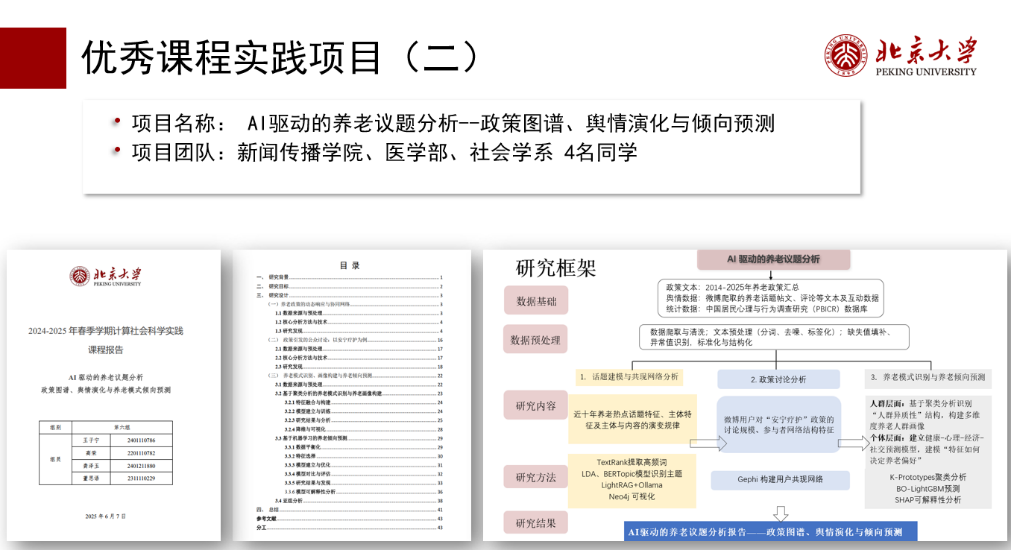 姚佳慧老师介绍了上年度 “计算社会科学交叉能力提升”证书项目的优秀实践成果。这些成果集中体现了项目的“AI+X”特色:来自不同院系和学科背景的同学在同一平台上协作完成从研究设计、数据采集、数据分析到成果展示的完整实践流程,并在现场展示了其中两项代表性成果——“全球AI合作态势感知与研判系统”和“AI驱动的养老议题分析”。