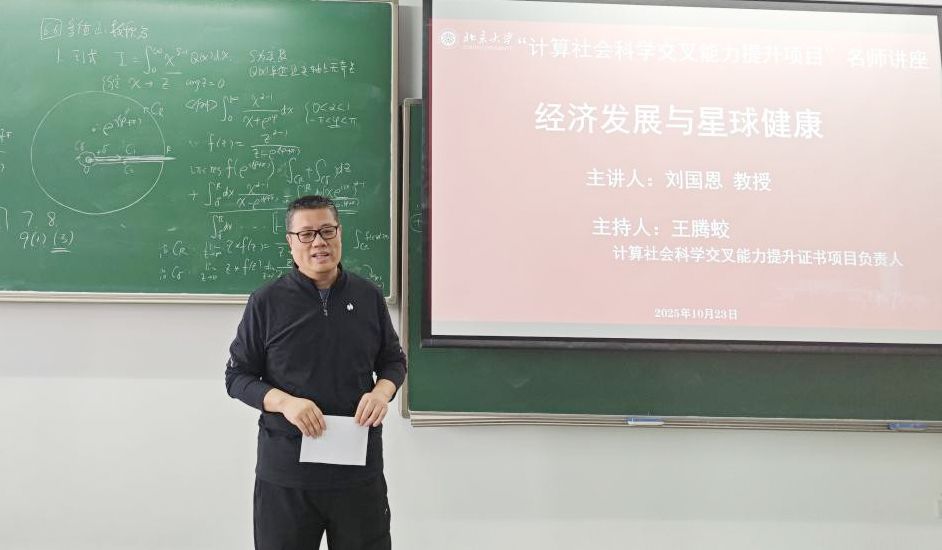 2025年10月23日,名师讲座第四讲正式开讲。讲座由计算社会科学交叉能力提升证书项目负责人王腾蛟主持,北京大学国家发展研究院博雅特聘教授、北京大学全球健康发展研究院院长、北京大学中国卫生经济研究中心主任、北京大学教育经济研究所学术委员会主任、中国医学科学院学部委员刘国恩教授以“经济增长与星球健康”为主题做了精彩报告。