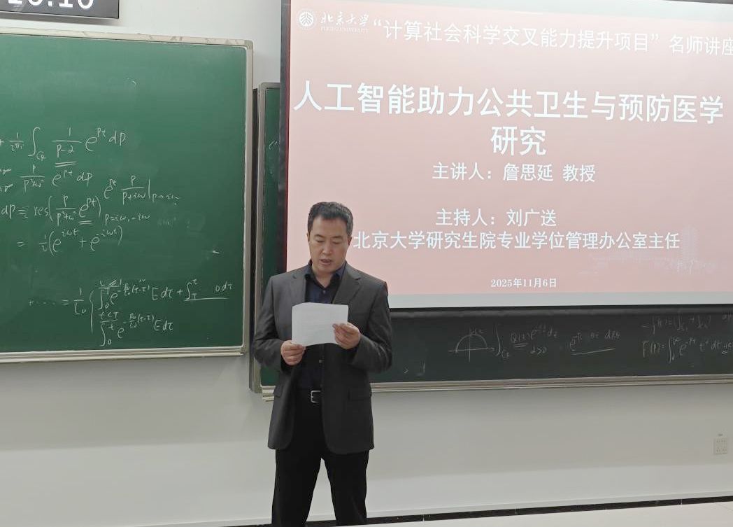 2025年11月6日,名师讲座第五讲正式开讲。讲座由北京大学研究生院专业学位管理办公室主任刘广送主持,北京大学公共卫生学院院长詹思延教授以“AI助力公共卫生与预防医学研究与实践”为主题做了精彩报告。