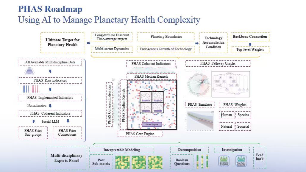 作为星球健康追踪的“数字罗盘”,PHAS构建了一个多学科理论、多层次结构的人工智能驱动数字大模型,首次实现了涵盖全球各国和地区、实时动态、视觉交互的星球健康系统,以绘制人类发展足迹与广义星球边界关系的全景式进程。目前,PHAS模型可以对高达48000个关键变量指标进行动态的可视化测算和展示,并可提供基于PHAS计算核心的模拟测算和分析功能。同时,PHAS还开发了基础的政策实验室服务,用于在不同的情境下对设定的政策干预结果对星球健康各项指标的影响进行分析。PHAS模型包含了四大主轴星球健康坐标系:“人类健康”、“物种健康”、“环境健康”和“社会健康”,并基于来自全球各地开可获取的大数据源,通过机器学习、系统科学、专家反馈校准等机制进行建模和数据分析,旨在构建由北大发起和牵头、 国际团队联合参与开发的真正“全球公共品”,为促进星球健康和人类文明的可持续发展贡献力量。