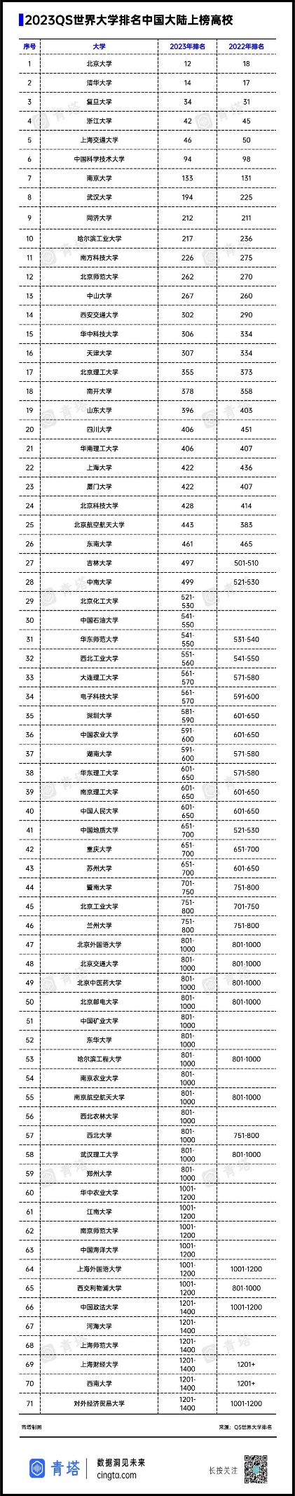 今年的QS世界大学排行榜共有71所中国内地高校上榜,上榜高校数为世界第三,仅次于美国(201所)和英国(90所)。